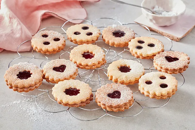 Das Johannisbeergelee glatt rühren und auf die heißen, nicht durchlöcherten Plätzchen streichen. Je 1 durchlöchertes Plätzchen aufsetzen und etwas andrücken.